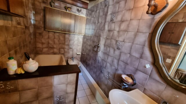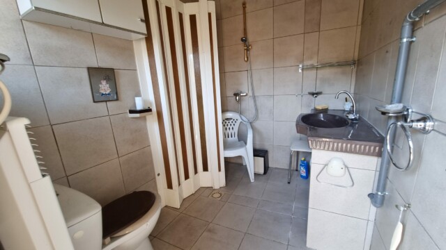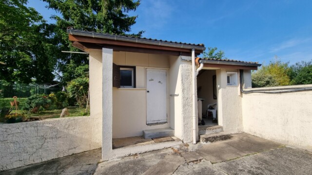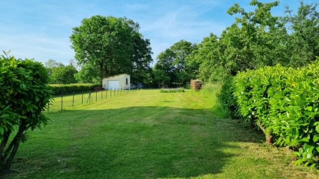 À l’extérieur : une petite cour, un cabanon avec douche, WC et vasque et un grand terrain, le tout sur une surface de 1343m².