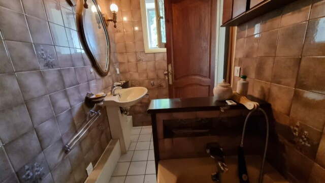 Au rez-de-chaussée : une cuisine ouverte sur une salle à manger de 34m², une chambre de 11,5m²avec un placard intégré, une salle de bains de 4,3m² avec baignoire, bidet et vasque et un WC avec vasque