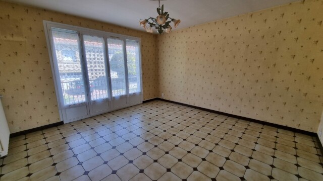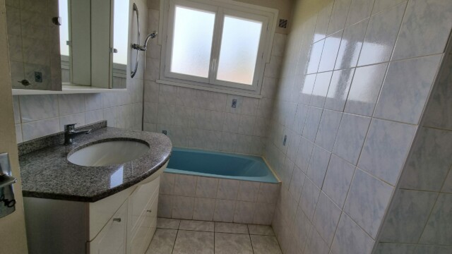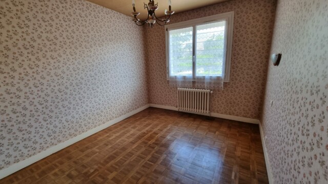 Une cuisine ouverte sur un séjour de 32,8m², une chambre de 14,4m², une chambre de 11,6m², une chambre de 9,9m², une salle de bains de 5,4m² avec vasque et baignoire, un WC de 2,4m², des placards et une cage d’escalier permettant l’accès au grenier.