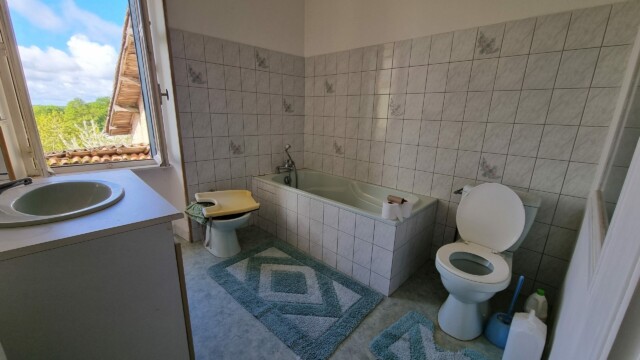 À l’étage : un dégagement, trois chambres dont deux grandes, une salle de bains avec baignoire, vasque et WC et au dessus un grenier