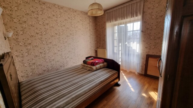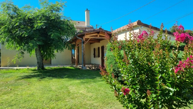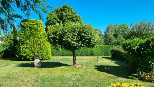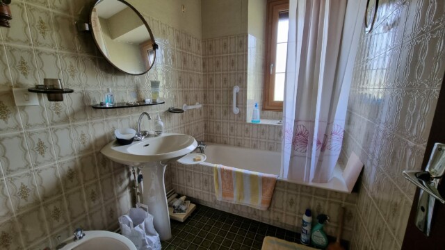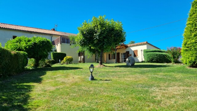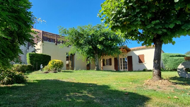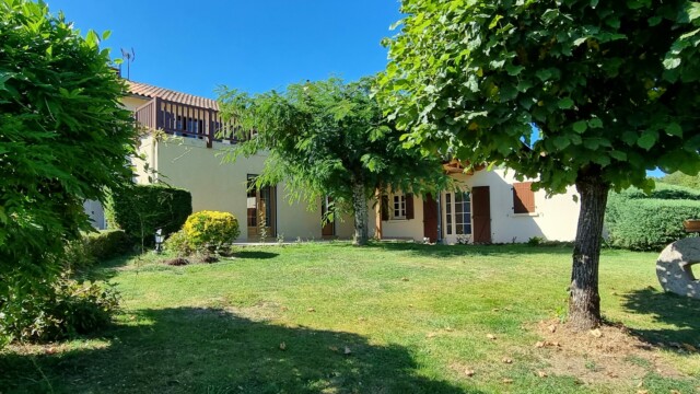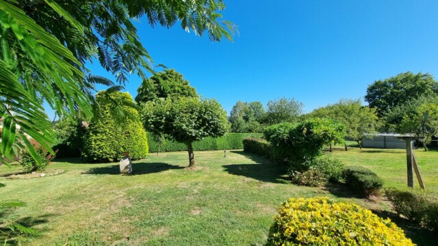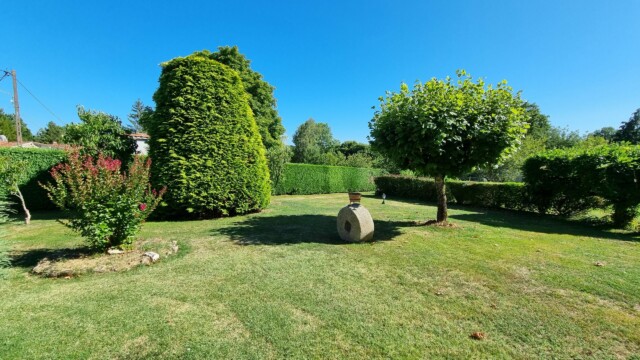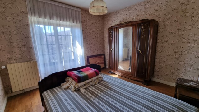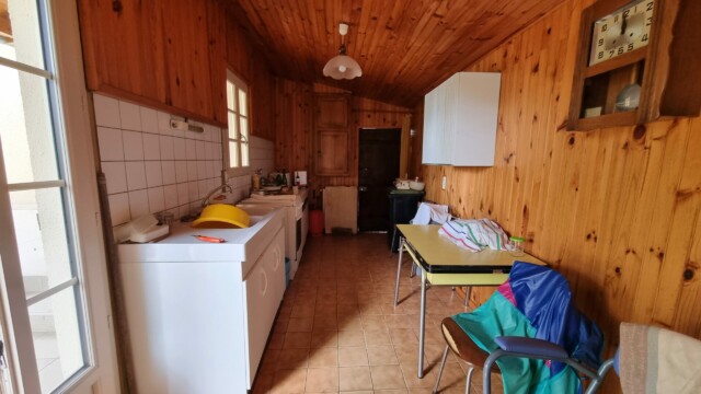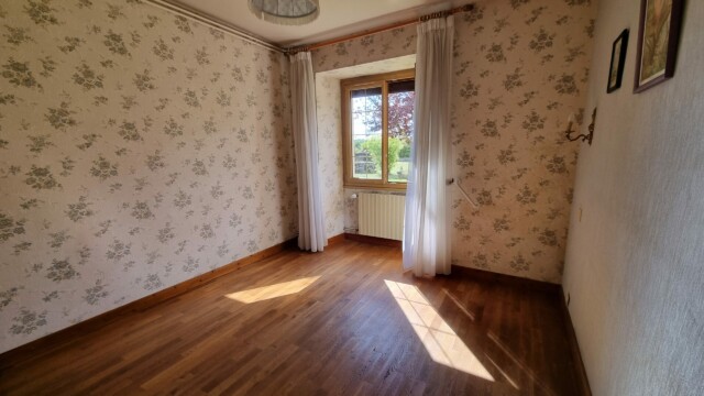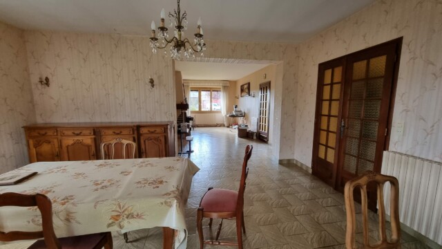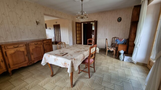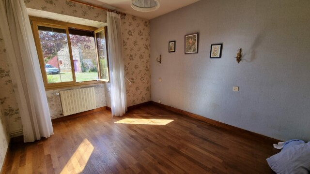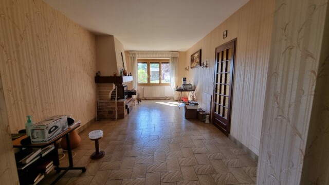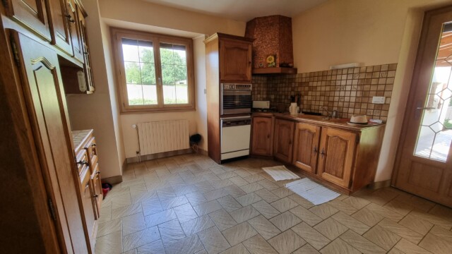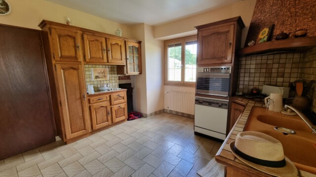 Au rez-de-chaussée : une cuisine de 12,5m², une salle à manger ouverte sur un salon avec un insert dans une cheminée de 41,5m², une chambre de 11m², une salle de bains avec vasque, bidet et baignoire de 3,5m², un WC de 1m², une cuisine d’été de 12m² et un cellier de 6,8m². Les huisseries sont en PVC double vitrage avec des volets électriques en aluminium.